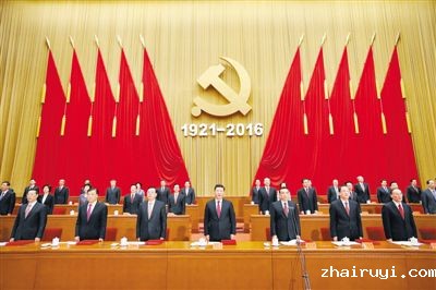 人民大会堂雄伟庄严,万人大礼堂灯火辉煌。主席台上方悬挂着“庆祝中国共产党成立95周年大会”会标。帷幕正中,由镰刀和锤头组成的中国共产党党徽在十面红旗映衬下熠熠生辉,“1921—2016”字样格外醒目。大礼堂二层眺台悬挂横幅:紧密团结在以习近平同志为总书记的党中央周围,锐意进取、开拓创新,全面推进党的建设新的伟大工程,为实现“两个一百年”奋斗目标、实现中华民族伟大复兴的中国梦而努力奋斗!