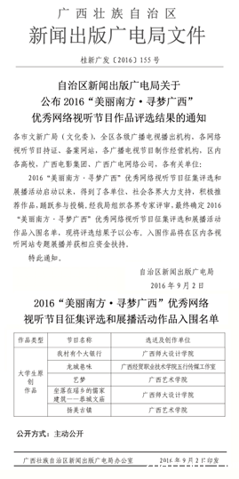 9月2日,自治区新闻出版广电局公布2016“美丽南方 寻梦广西”优秀网络视听节目征集评选和展播活动作品入围名单,我院选送的纪录片作品《艺·梦》和《扬美古镇》进入大学生原创作品组入围名单,作品将在区内各视听网站专题展播并获相应资金支持。