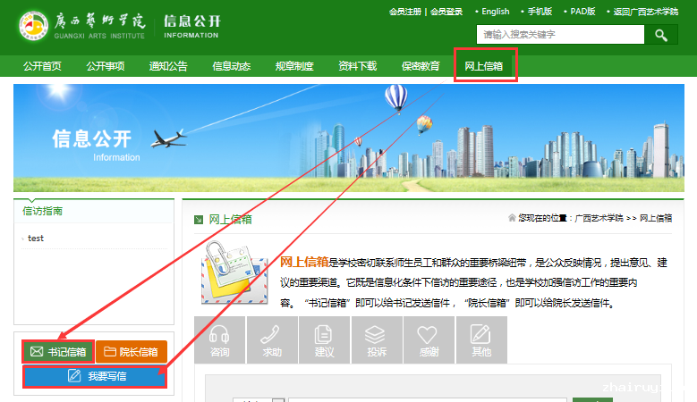 新版“网上信箱”网址:http://www.zhairuyi.com/Letter/index.aspx,点击网址即可进入信访平台。