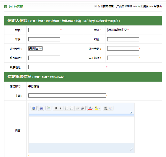 (2)进入“网上信箱”->点击“书记信箱”或“院长信箱”、“我要写信”->写信须知->写信页面,如下图所示: