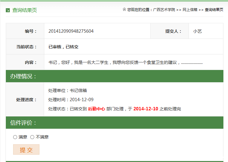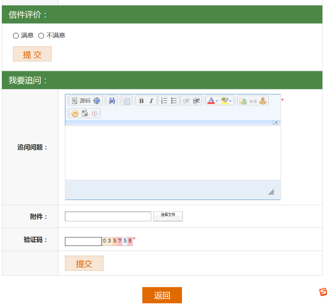 如若你对信件的回复不满意,可以通过信件查询结果页面进行追问和评价,如下图所示: