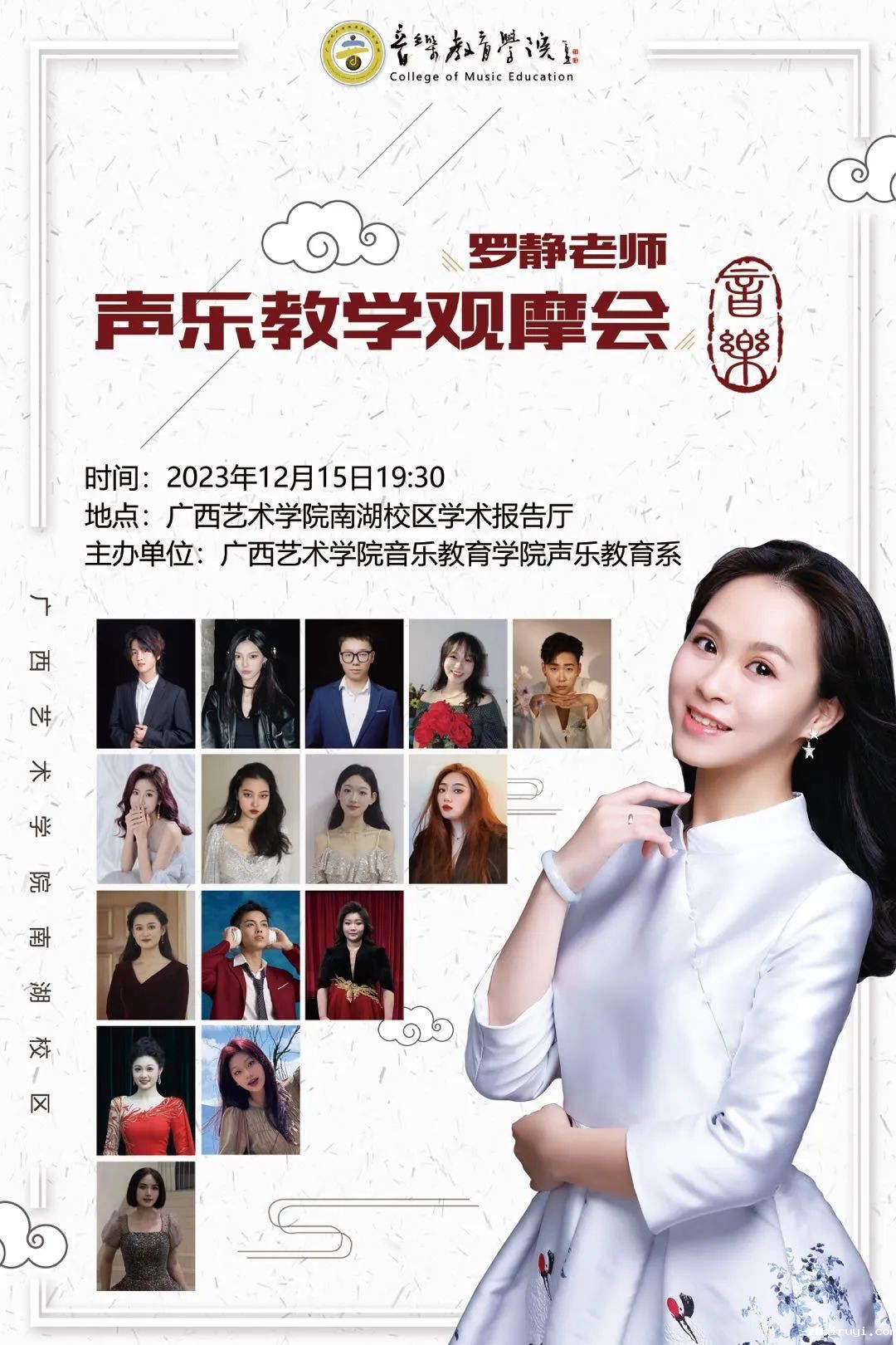 【音乐会预告】罗静老师声乐教学观摩会 来源: 作者: 发布时间:2023-12-13 00:11:16 浏览次数: 次 【字体:小 大】 邀请函 尊敬的 先生/女士:兹定于2023年12月15日(周五)19:30 ,在点点taptap扑克南湖校区学术报告厅举办罗静老师声乐教学观摩会,敬请莅临指导! 终审:梁姚姚 初审:罗静 编辑:王悦 文案:音乐教育学院“蒲公英”记者团 分享到: 【打印正文】